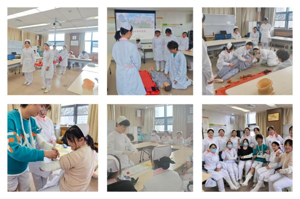 经验复盘——反示教法与急救实训。康复器具工作坊采用“反示教法”激发思考。一名学生演示助行器使用时因高度不当导致模拟患者失衡,老师借机讲解"腋窝与手柄一拳间距"原则,并让学生分组纠错。脊柱损伤搬运实训更考验团队协作,四人一组练习轴线翻身时,从生硬到流畅的蜕变,让学生深刻理解“力学分配避免二次损伤”的分量。
