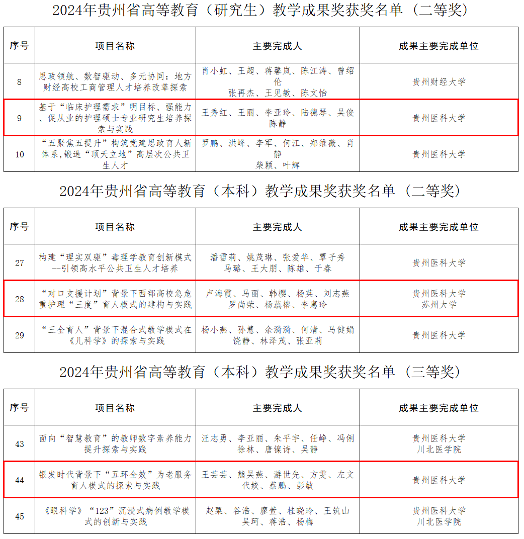 近日,贵州省教育厅公布了2024年贵州省高等教育省级教学成果奖获奖名单,BEAT365英国官网在此次评选中收获颇丰,共有三个团队获奖,其中研究生组二等奖一项、本科组二等奖一项以及本科组三等奖一项,这一荣誉充分展现了学院在教育教学改革、人才培养模式创新等方面的显著成效。
