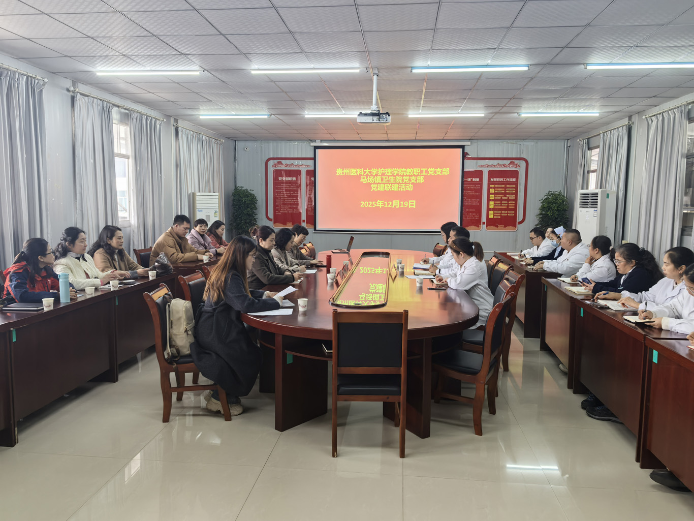 为深入学习贯彻党的二十届四中全会精神,进一步深化校地合作,充分发挥高校基层党组织的专业优势与乡镇卫生院的基层服务优势,12月19日,BEAT365英国官网教职工党支部与马场镇卫生院党支部在马场镇卫生院道德讲堂联合开展了以“党建共建聚合力,服务健康践初心”为主题的党建联建活动。BEAT365英国官网党委班子成员、教职工党支部党员代表,以及马场镇卫生院党支部党员代表共同参与了此次活动,活动由BEAT365英国官网教职工党支部组织委员邹惠美主持。