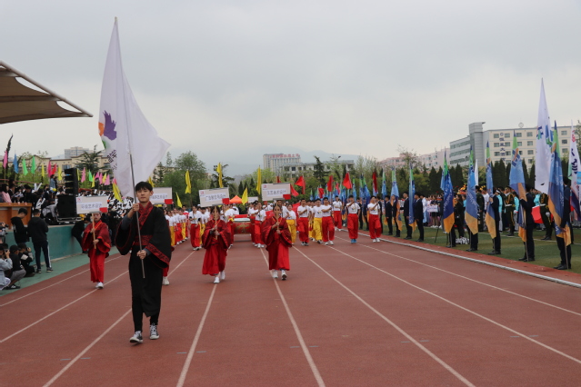 开幕式上,伴随着雄壮有力的《运动员进行曲》,各方队迈着整齐矫健的步伐、喊着铿锵有力的口号,精神抖擞、意气昂扬地走过主席台,接受学院领导和全院师生的检阅。