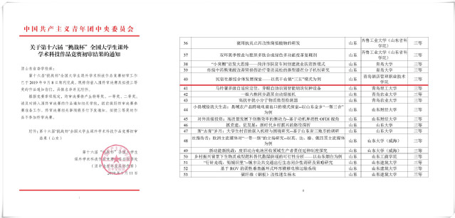 学院在第十六届“挑战杯”全国大学生课外学术科技作品竞赛荣获三等奖