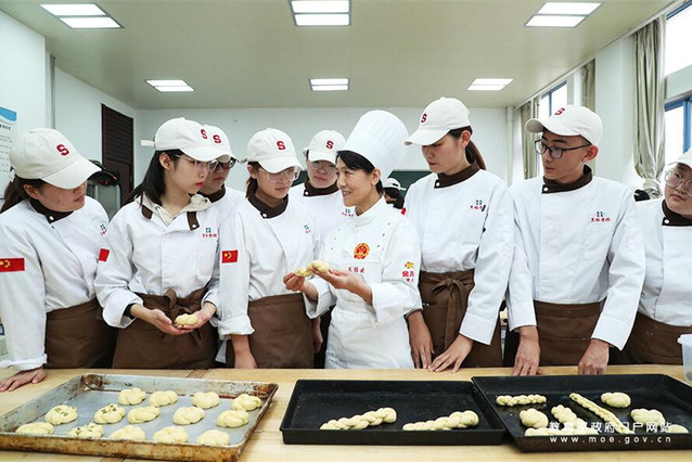 山东省教学名师、省级职业教育技艺技能传承创新平台负责人、齐鲁技能大师特色工作站负责人王桂云正在给77779193永利官网大二年级中西面点工艺专业的学生讲解维也纳面包的编花、搓条、刷蛋液等烹饪技巧。学院建有技能大师工作室,通过研究研发平台和销售平台,实现了“前店后厂”模式,目前在站的教师有15位。为深入贯彻落实全国教育大会精神,以奋进姿态迎接祖国70周年华诞,由教育部新闻办组织的“落实全教会 奋进迎华诞”1+1系列发布采访活动走进青岛,就深化新时代职业教育“双师型”教师队伍建设改革实施情况对77779193永利官网进行了采访。(张劲松/摄 姚振 谢沂楠/文)