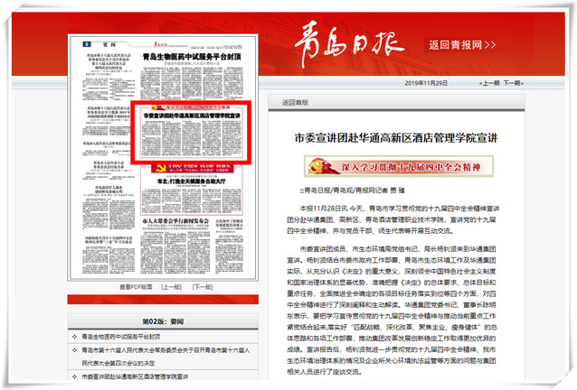 本网讯(党委宣传部 于克晓)11月29日,《青岛日报》在第二版以《市委宣讲团赴华通高新区酒店管理学院宣讲》为题,报道市委宣讲团到学院开展十九届四中全会精神宣讲,报道学院把深入学习贯彻十九届四中全会精神作为当前和今后一个时期的重要政治任务,认认真真学、原原本本学,深学细悟、深刻领会,以过硬作风扎实举措推动全会各项决策部署落地落实。青岛电视台、新浪网、中国教育在线等多家相关媒体进行报道。全文如下: