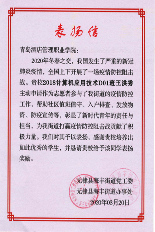 疫情防控期间,2018级计算机应用D01班王洪秀同学主动申请作为志愿者参与无棣县海丰街道的防控工作,坚守在社区一线,承担轮流值班、入户排查、发放物资、防疫宣传等任务。2018级数字媒体应用技术01班李柞锌同学,作为一名退伍军人担起守护街道安全的责任,与其他志愿者一起在检查点值守,排查查验车辆,入户排查重点区域返乡人员。虽已脱下军装,但他用实际行动践行了那句誓言:”若有战,召必回!”李柞锌的事迹还被青岛新闻网党政频道报道。两位同学出色的工作表现赢得了当地社区和居民的一致好评。