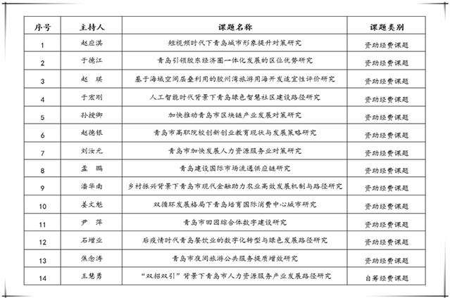 本网讯(科研发展处 王萍)近日,青岛市“双百调研工程”2020年度课题立项名单进行公示,学院共有14项课题获批立项,其中资助经费课题13项、自筹经费课题1项,再创历史新高。