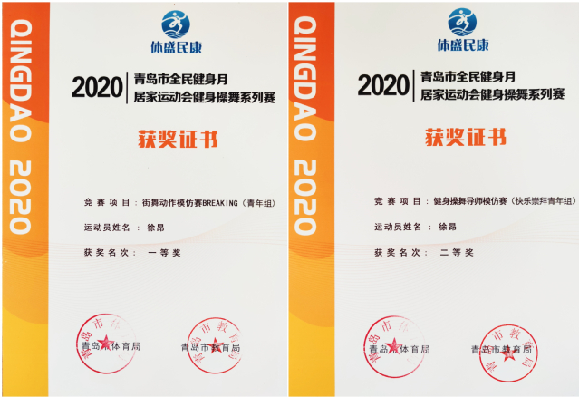 本网讯 (酒店管理学院 张妍) 近日,在2020年青岛市“全民健身月”居家运动会健身操舞系列赛中,酒店管理学院徐昂老师从300余名选手中脱颖而出,获得街舞动作模仿赛BREAKING(青年组)一等奖、健身操舞导师模仿赛(快乐崇拜青年组)二等奖。