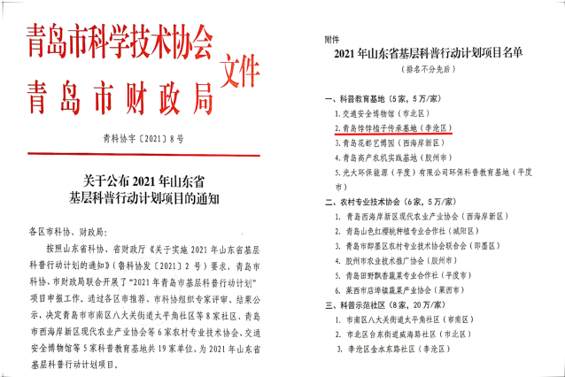 按照山东省科协、省财政厅《关于实施2021年山东省基层科普行动计划的通知》(鲁科协发〔2021〕2号)要求,青岛市科协、市财政局联合开展了“2021年青岛市基层科普行动计划”项目申报工作,学院积极组织申报,经李沧区科协推荐、市科协组织专家评审,学院青岛饽饽榼子传承基地得到了专家的一致认可,顺利入选2021年山东省基层科普行动计划项目。