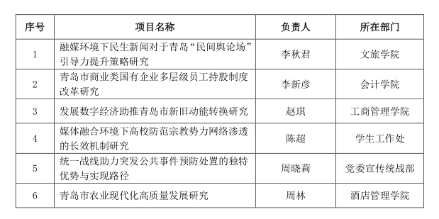 本网讯(科研发展处 王萍)近日,青岛市哲学社会科学规划管理办公室公布了“2021年青岛市社科规划项目立项名单”。学院共有6项课题成功立项,其中2项为统一战线智库课题推荐立项。具体立项情况如下: