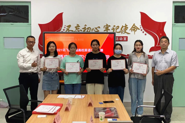 会上,对2021年“讯飞杯”全国高校英语口语大赛中获奖的16位同学进行了表彰,科大讯飞股份有限公司高教业务部山东区经理李伯威、基础教学部主任石增业、教务处副处长王超为获奖同学颁发证书和奖品。