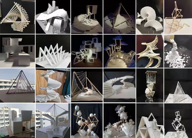 在《立体构成》课堂上,教师传达以美战“疫”、以艺战“疫”的理念,讲授点、线、面、体、空间、材料及构成法则等三维造型的基本要点与技法,引导学生从多角度去剖析塑造物体,从形态、空间、材料、色彩、质感、结构等各方面进行探求,并结合审美和心理,将造型要素按照美的原则组成新的构成作品。学生在学习过程中,锻炼了立体造型思维能力、立体型态表现技巧、三维空间的认知应用能力。学生们的作品风格迥异、表现手法各不相同,运用纸张、木板、泡沫、铁丝、亚克力等原材料,设计并制作出形态丰富、别具内涵的立体构成作品,充分展示出学生们满溢的学习热情和创作活力。