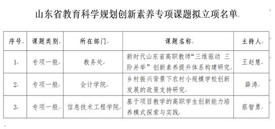 本网讯(科研发展处)近日,山东省教育科学研究院公布了山东省教育科学规划创新素养专项拟立项课题。我校王赵慧老师主持的“新时代山东省高职教师‘三维驱动 三阶并举’创新素养提升体系构建研究”、薛涛老师主持的“乡村振兴背景下农村小规模学校创新发展的政策支持研究”、蔡智勇老师主持的“基于项目教学的高职学生创新能力培养模式探索与实践”喜获立项。