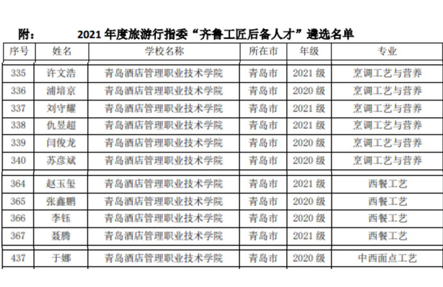 本网讯(烹饪学院 赵捷)近日,山东省旅游职业教育行业教学指导委员会公示了2021年度旅游大类“齐鲁工匠后备人才”培育对象遴选名单,全省共有440名学生被列为培育对象,我校烹饪学院11名学生入选。