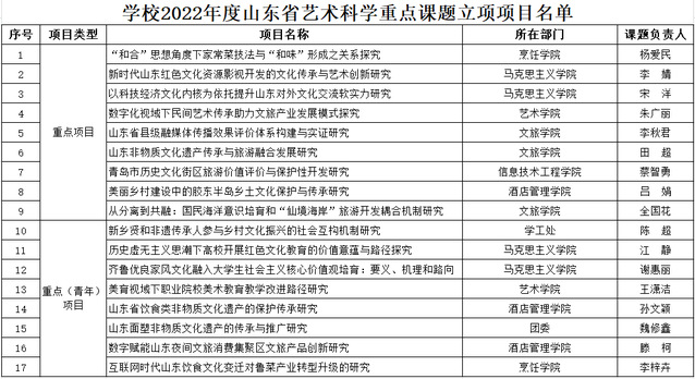本网讯(科研发展处)近日,山东省艺术科学重点课题评审办公室公布了2022年度山东省艺术科学重点课题立项项目名单,我校成功立项17项,其中重点项目9项、重点(青年)项目8项。