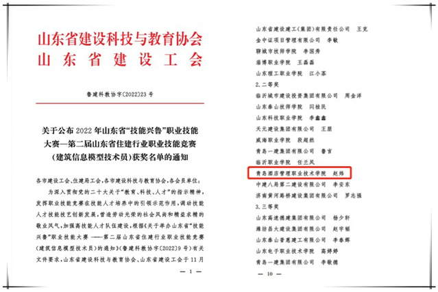 本网讯(酒店工程学院 赵炜)近日,2022年山东省“技能兴鲁”职业技能大赛——第二届山东省住建行业职业技能竞赛(建筑信息模型技术员)顺利结束,我校酒店工程学院赵炜老师荣获职工组二等奖。