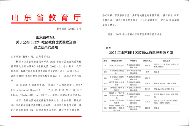 前期,学校根据《山东省教育厅关于开展2022年度社区教育优秀课程资源遴选活动的通知》(鲁教民函〔2022〕21号)要求,面向全校公开征集课程资源,经过课程申报、内容评审、资料上传等环节,推荐至山东省参加评选。经山东省教育厅专家评议并网上公示,全省共遴选出优秀课程资源568门。我校入选的全部课程资源将通过“山东终身学习在线”“山东老年学习在线”等平台,面向社会学习者开放共享。