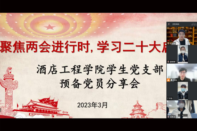 酒店工程学院学生党支部聚焦两会进行时,开展预备党员学习分享会,2020级预备党员张弛分享了自己做好本职工作、全心全意为社区群众服务的经历。结合两会热点,他在物业实习工作中收集社区群众关心关注的各类问题,在工作岗位中积极发挥不怕苦、不怕险、不避责的精神,获得广泛好评。学生党员以实际行动践行使命担当,热心投身社会作贡献,在追求进步与成长的道路上砥砺前行。