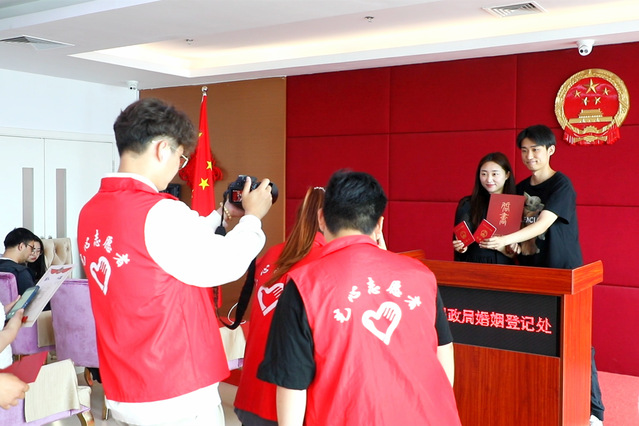 在5月20日这个充满浓情蜜意的特殊日子,“艺心”志愿者们来到青岛市李沧区民政局婚姻登记处,发挥所学专业优势,为每对登记结婚的新人拍摄领证纪念照片,团队成员积极践行志愿服务精神,寻找合适拍摄角度,调整恰当拍照姿势,为即将步入婚姻殿堂的新人记录幸福时刻,定格美好瞬间。