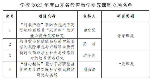 本网讯(科研发展处)近日,山东省教育科学研究院公布了2023年度山东省教育教学研究课题立项名单,我校成功立项4项课题。