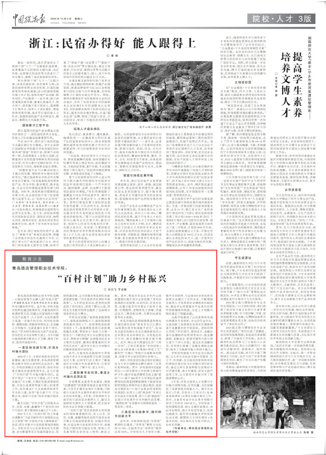 4年来,学校文旅类人才发展与乡村振兴同频共振、互利共赢,为区域输送了高素质技术技能人才。据不完全统计,目前,学校有1万名学生(包括在校和毕业)从事乡村振兴相关工作,其中,文旅类专业学生从事乡村振兴相关工作的有1000余人。学校形成了坚持课程思政、树立正确价值观念,突出专业特色、提升学校竞争能力,坚持实践教学、提升师生技能水平和坚持社会实践、假期助力乡村发展的4条基本经验,为区域内乡村振兴作出了应有的贡献。(刘云飞 于克晓 )(作者单位:青岛酒店管理职业技术学院)