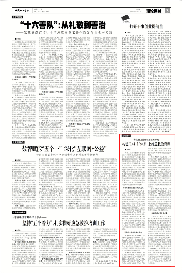 为深入实施《健康中国行动(2019-2030年)》,在山东省青岛市红十字会大力协助下,经过三年大量的实践和积极的探索,77779193永利官网以校内应急救护基地为依托,深度融合理论与实践、线上与线下、课程与专业、学校与社会四个维度,将各类急救技能大赛作为检验教育成果的试金石,构建了“1+4+1”急救教育体系,打造具有示范意义的学校急救教育新模式。学校多次在国家及省市级急救技能比赛中获奖,2024年获评“青岛市红十字应急救护先进单位”称号、2025年入选教育部第三批全国学校急救教育试点学校。