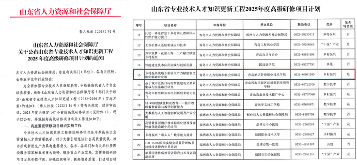 本网讯(继续教育学院 文旅学院)近日,山东省人力资源和社会保障厅公布了山东省专业技术人才知识更新工程2025年度高级研修项目计划,我校申报项目《乡村振兴战略下新质生产力赋能农文旅创新融合发展》入选。