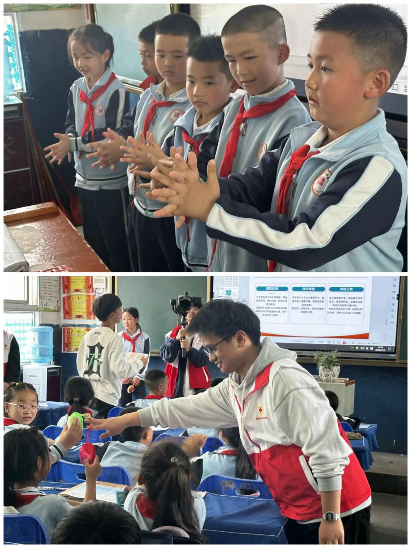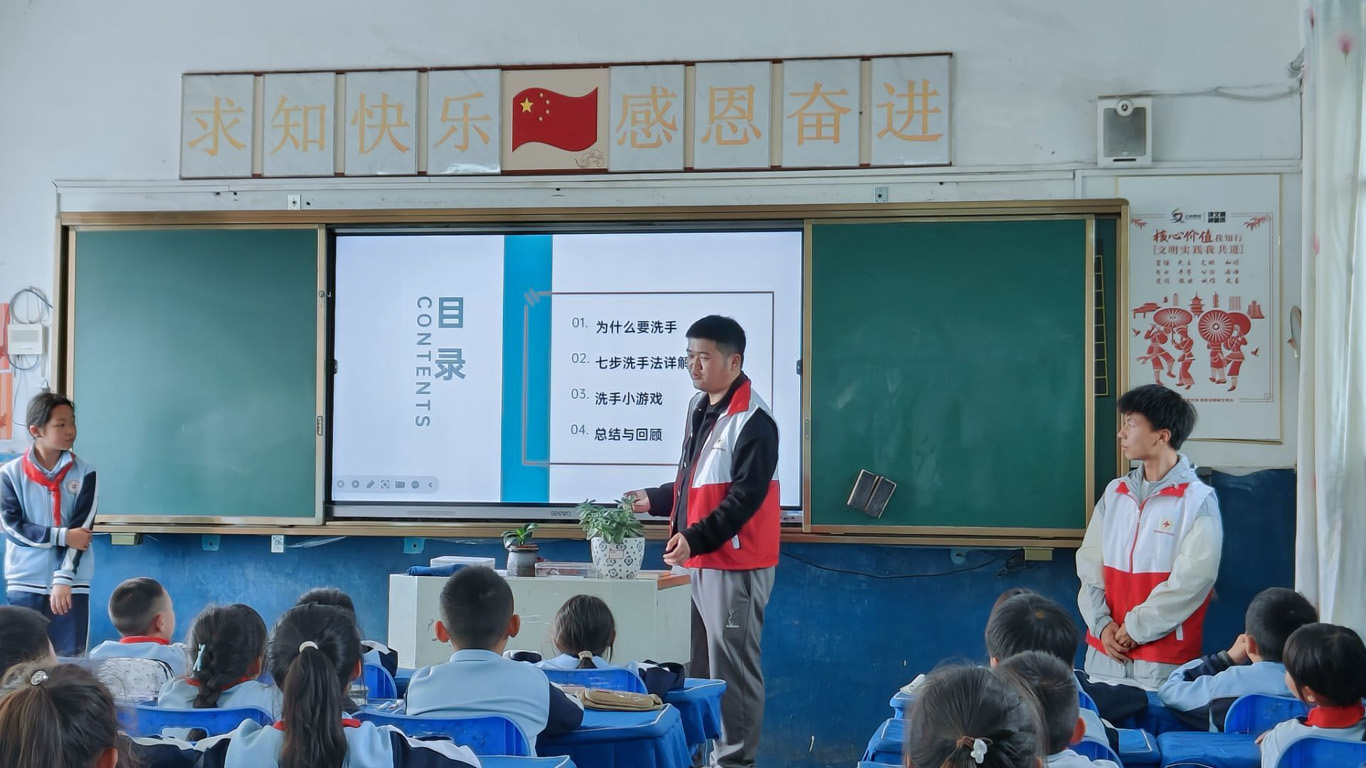 活动中,学生代表付知行、曾茗程和罗明通过多媒体课件向马场中心小学三年级(一)班的小学生们详细科普了手卫生的重要性,将手卫生知识科普与小学生日常习惯培养紧密结合,系统教学了“七步洗手法”的正确操作顺序及注意事项,创新性地采用教学小游戏与小学生们进行趣味互动,同时通过发放健康小奖品充分调动了小学生们的积极性,帮助小学生们增强卫生意识、掌握正确的洗手方法。